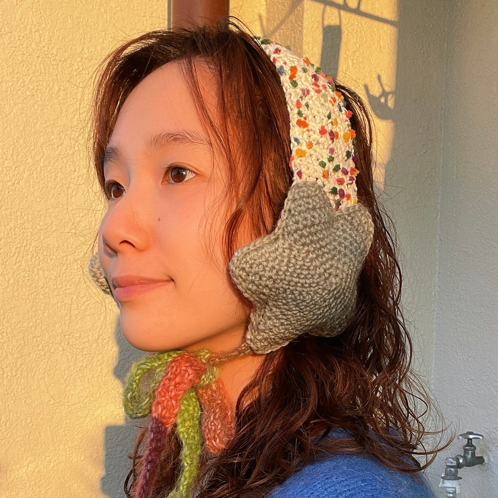 頭周りの部分には粒々毛糸をつけてみました!